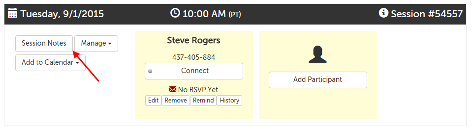 1. Once you have scheduled a session, a "Session Notes" will appear on the new session panel. Click on it.