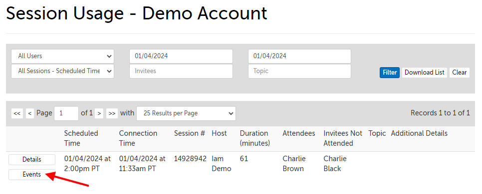 The "Details" button allows you to view the timestamps/duration particular participants entered the session. This feature is currently only available with Zoom-based sessions that were connected to.