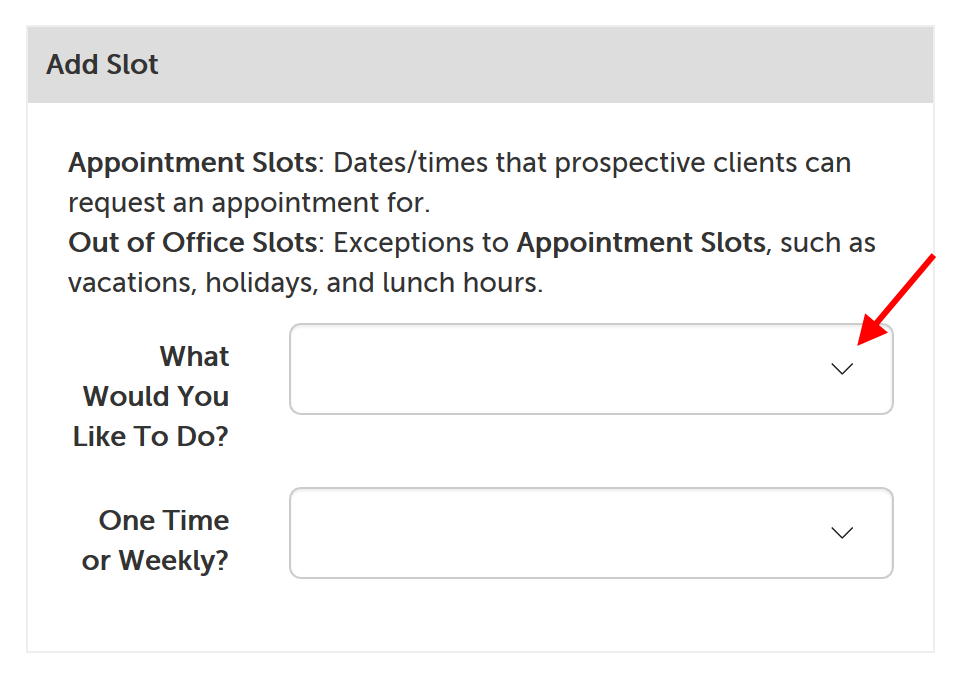 Appointment Slots allow you to list available dates and times on a public calendar, so that current and prospective clients can request a scheduled session, if the provider has the feature enabled. For a good overview of this feature, please see the video recording of a webinar we hosted on this type of virtual clinic.