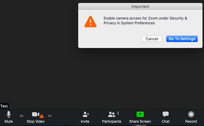1. If you are in a session and recieved the above error, click on the videocamera icon and then, on the message that appears, click on "Go to Settings".