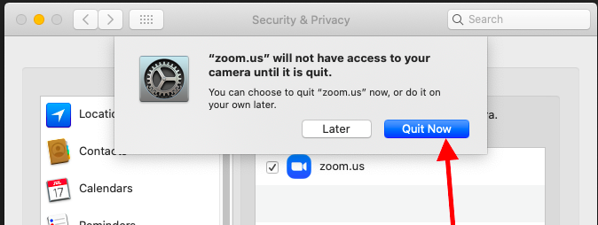 4. Once the preferences are unlocked, click on the checkbox next to "zoom.us". A prompt will appear to let you know that this setting will not be able to take effect you quit Zoom. Let the other person/people in your session know that you'll be right back, and then click "Quit Now".